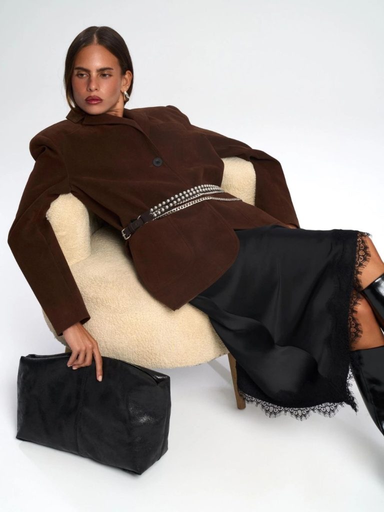 Sezonun en dikkat çekici detaylarından biri ise ucu dantelli saten etek modelleri. İnce dantel bordürleriyle hareket kazanan bu parçalar, yürüdükçe dalgalanan kumaşıyla zarif bir siluet yaratıyor. Mai’nin özgün tasarım anlayışı, bu eteklere boho bir özgürlük katıyor. Gün ışığında sade bir gömlekle, akşam saatlerinde ise ince askılı bir bluzla tamamlandığında, aynı parça bambaşka bir hikâye anlatıyor.